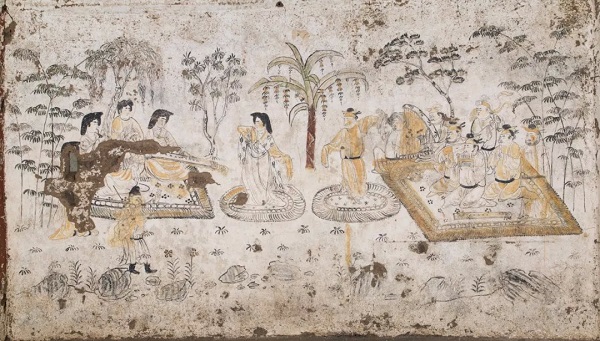 笔者在讨论韩休墓北壁山水屏风时提出过一个初步的看法,正是在盛唐时期的长安,上层社会出现了对于两种截然不同的绘画风格兼容并包的接受和欣赏,一种是李思训所代表的焕烂求备、细密精致的体制,一种是吴道玄所代表的自由洒脱、不拘细致末节的画法。前者更适用于乐舞图之类的题材,后者则为画工受制于时间或报酬而快速完成壁画找到一种借口。我们在这幅壁画中所看到的是题材和画法的错误对接,由此导致了画面一改再改,混乱不堪。尽管如此,韩休墓乐舞图在结构和细节上,还是呈现了唐代同类壁画中最为华美绚丽的一种图式。