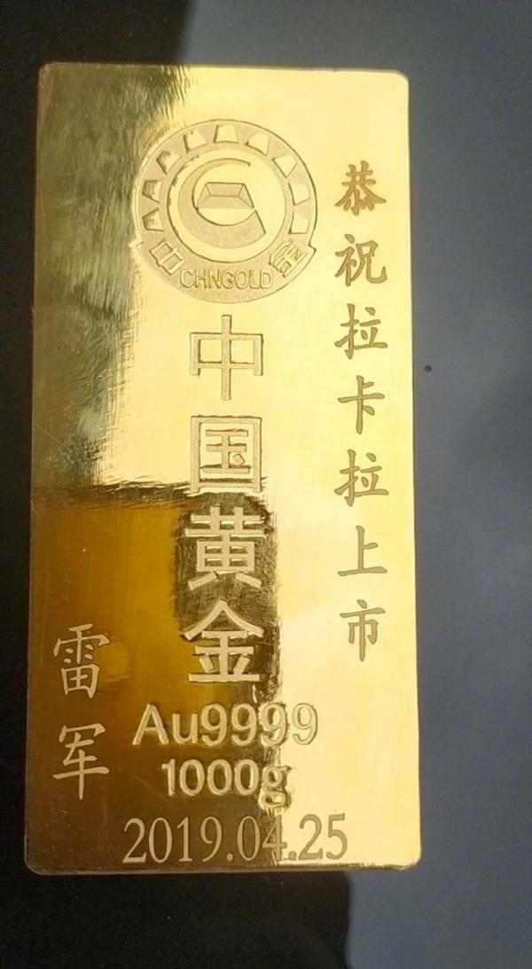 4月28日,拉卡拉首席执行官孙陶然在新浪微博上晒出一张金砖照片——雷军履约给他送了一块一千克的9999黄金(万足金)。按目前9999黄金价格281.35元/克计算,这块金砖大约价值28万元。