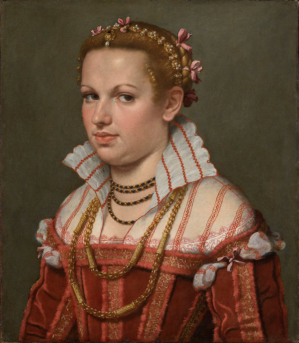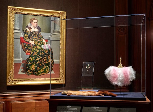 展览中有两幅意大利诗人和伯爵夫人Isotta Brembati的画像,一幅绘于1550年,此时20岁的女诗人穿着粉嫩, 粉红色的蝴蝶结展现出年轻女子的自然清新;而另外一张则是坐在华美凳子之上伯爵夫人的身份,尽管同样戴有粉色的蝴蝶结和耳环,但珍珠的宝石十字架、貂皮制成的披肩,金色的头带,粉红色和白色条纹的羽毛衣领均显得雍容华贵,两张画也可看出这位女性成长的痕迹。
