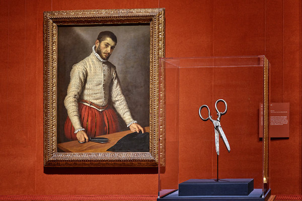 莫罗尼最著名的肖像画的是一位无名的普通裁缝,这张作品完成于1570年左右,从伦敦国家美术馆借展到纽约,这幅作品对于一位追求自己手艺的工匠来说是不寻常的。 他拿着剪刀,他正准备在他面前的桌子上铺开宽阔的布料(真正的16世纪的铁剪也以实物方式展出)。观众似乎化身为客户,学徒或是朋友站在他对面的桌子上,而且很明显对面站的人打断了他。 裁缝停顿了一下——这是莫罗尼另一个创新,以动态的动作而不是静态姿势显示的肖像主题。作品中的裁缝专注地看着我们,但毫无疑问他很快就会回到自己的工作中。