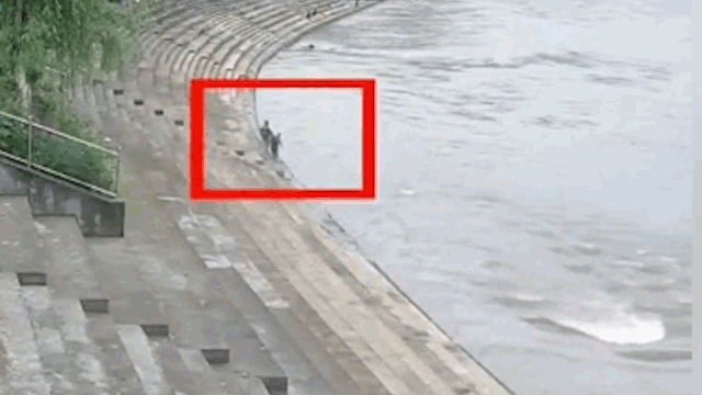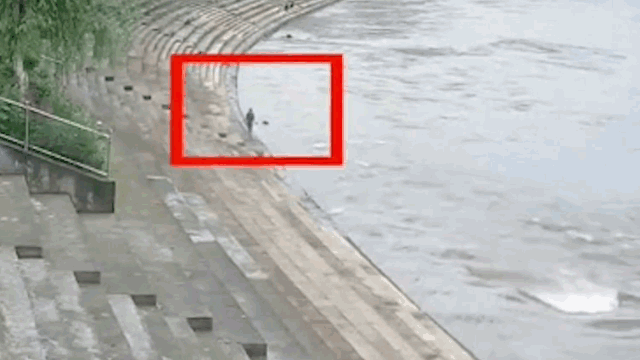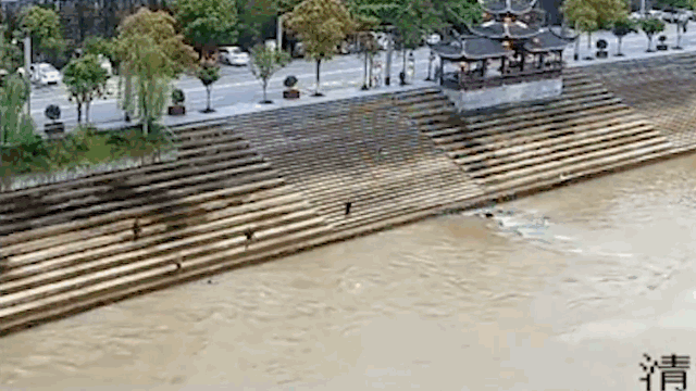 江水湍急,男孩落水后被裹挟着迅速漂远,