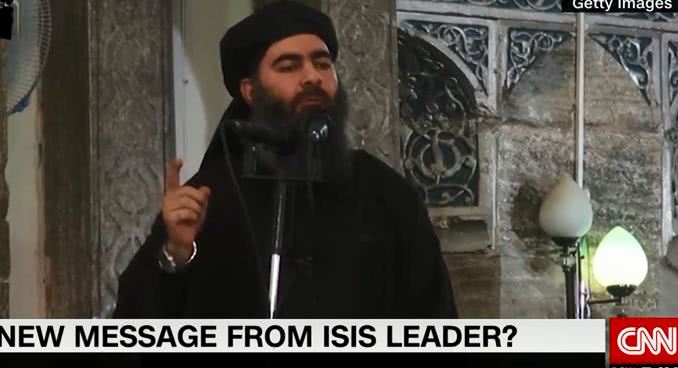 CNN视频截图 背景图为2014年巴格达迪在公开视频中露面
