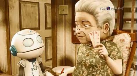从此,老人把机器人当作了自己的孩子,他们一起吃饭,小家伙吃得满嘴是油,奶奶会耐心慈爱地为他擦干。机器人电池用完了,奶奶会及时为他更换。