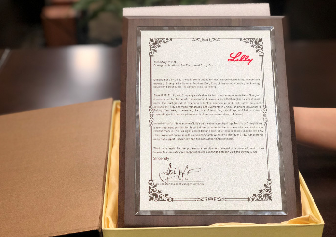 ▲ 近日,上海市食品药品检验所收到一份来自美国制药公司——礼来中国总裁季礼文(Mr. Julio Gay-Ger)的致谢函