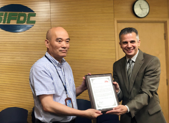 ▲ 礼来中国总裁季礼文向上海食药检所党委书记杨全送来致谢函