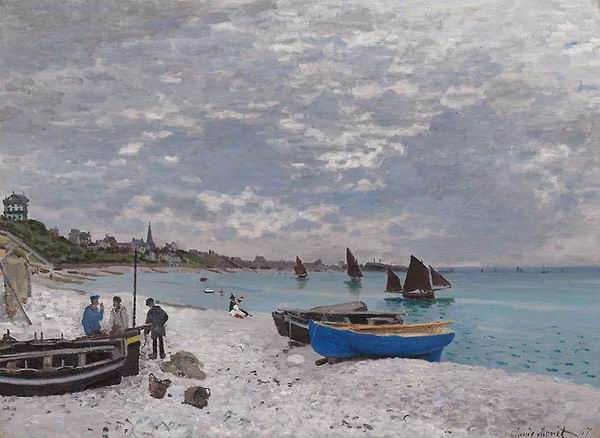 那时莫奈以河为主题的画作还不多。前一个夏天,他画了描绘诺曼底海滩的风景画,除了海滩以外,他还画了当地的渔夫以及衣着时尚的游客。