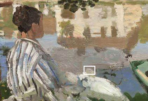 莫奈《塞纳河畔的本尼科特》,1868年。X射线显示莫奈先画了河流轮廓和堤岸等地方,后来又添加了卡米尔的人物形象。