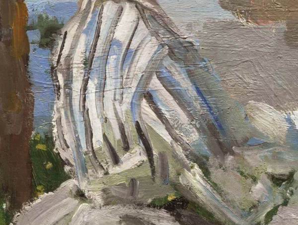 蓝色的竖条是牧牛女,她的衣裙朴素单调,与河边衣帽考究的女人形成反差。这样的描绘与道拜尼于1859年在格劳顿创作的《在水一方》 (Le bac à Gloton) 不谋而合。