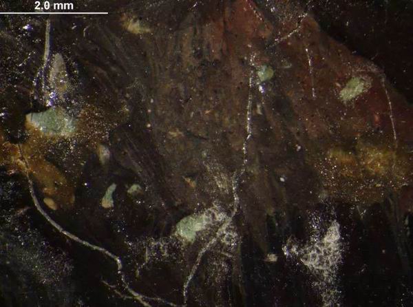 在显微镜下的观察,卡米尔衣衫上的深绿色是碧草或者垂荫的延伸。