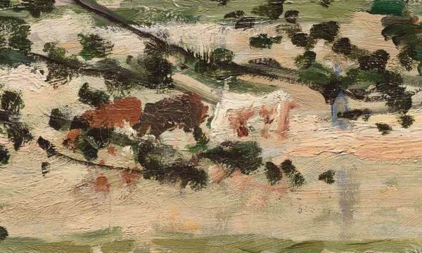 在两个女人的左侧,莫奈呈现了一组城市与乡村、现代与传统、休闲与劳作的对比景象。棕色和白色的色块代表着正在饮水的牛。