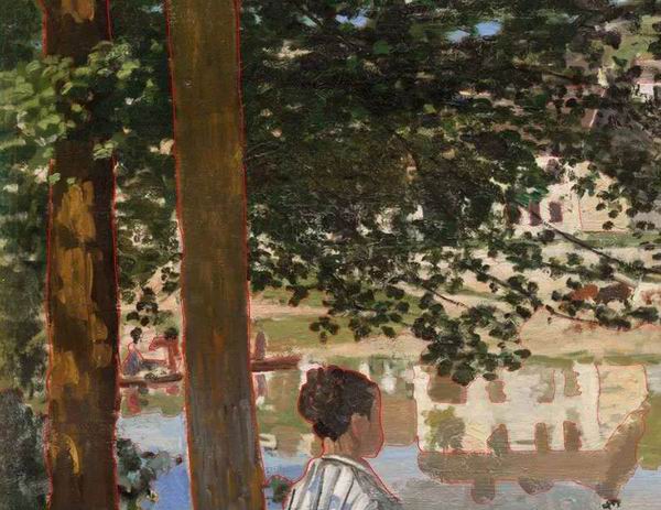 左边有一条赭色的小船,由于树荫的影映和年久生锈,显得斑驳黯淡,倒影难辨,使画面看起来更加真实生动。船上有一个女人面向船尾而坐,蓝衣粉帽,身披三角形披巾,由此可见她和对岸的两个女人相似,具有优越的社会地位,是到格劳顿来度假的游客。