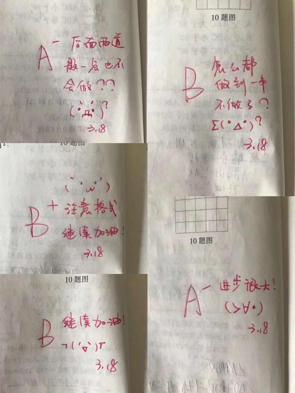 “昨天测验了一下,现在批两分钟卷子,就要给自己做十分钟心肺复苏。”“不教书你永远也体会不到,一道题讲了二十遍然而学生还是给你胡写的那种怒火。”“感觉每一天都在历险,今天的‘守关怪物’是学生长毛儿的作业本。”……