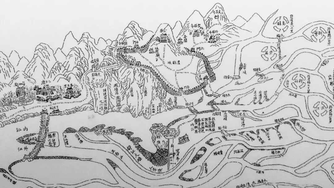 《蜀川胜概图》局部。此画相传为北宋画家李公麟的名作,所绘内容为宋代川峡四路(今四川、重庆)的著名山岳、河流、城池风貌,且对宋代的地理名称有详细标注,在具有很高艺术价值的同时,兼具很高的历史研究价值。