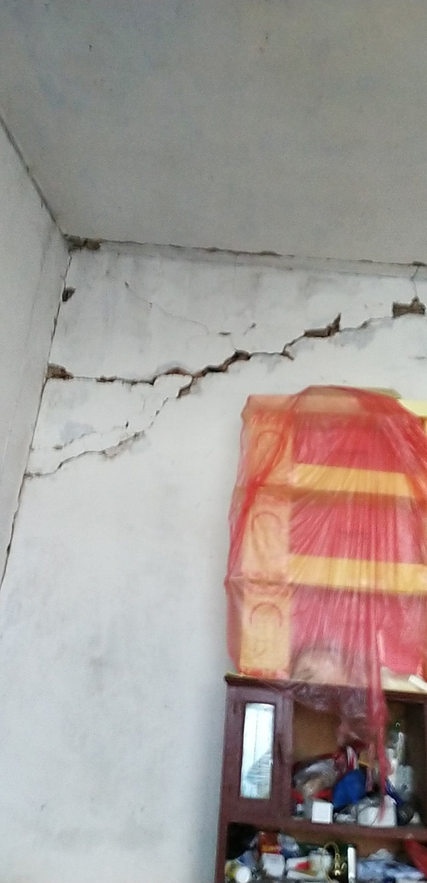 后来我又进去一次,给老婆和女儿拿衣服。我家的房子一楼顶是预制板,二楼顶才是现浇的。我看到楼上墙壁上有三个拇指宽的裂缝,电脑等很多物件都砸在地上,打烂了。我只是把倒在床头的衣服连着衣架一起抱起,从二楼窗户丢下去,接着就溜出去,一刻也不敢多留。
