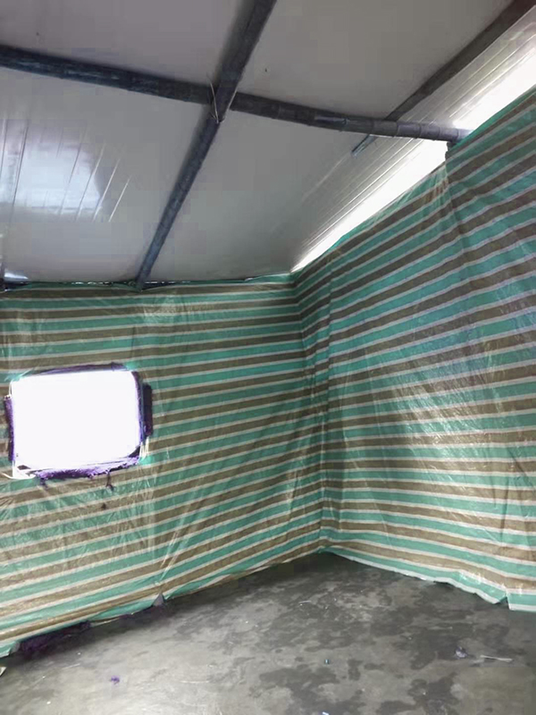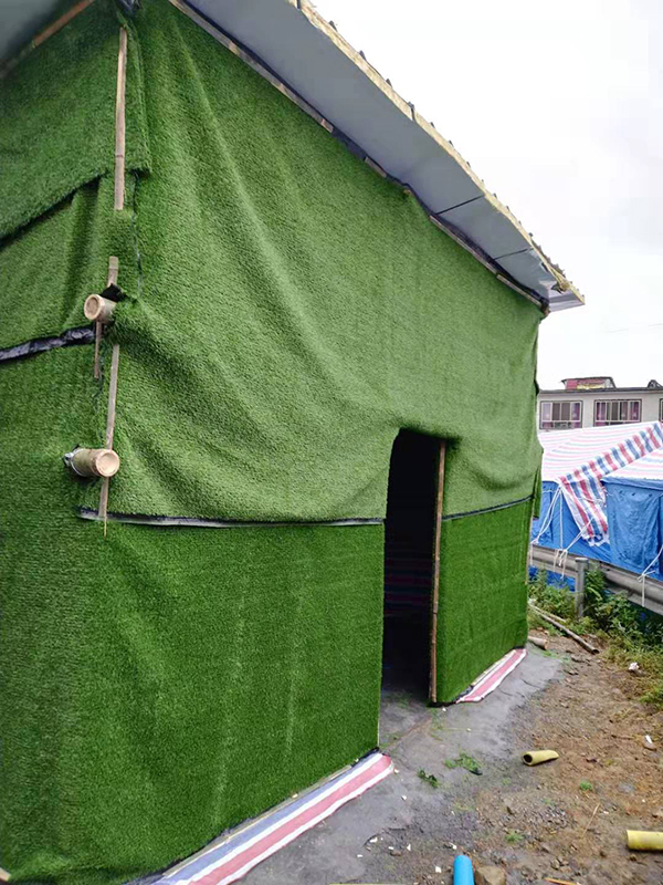目前陆续在修安置房,一户有三人以上的可住入20平方米的安置房,用彩钢顶盖的,胶布绑住墙面,外面围了一圈绿网,像山上竹子的颜色。已经盖起几间了,还没通电,人也还没住进去。20平方米要掏1200元,我不假思索就掏了,帐篷里总归不舒服。