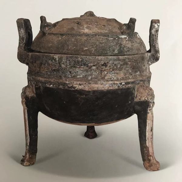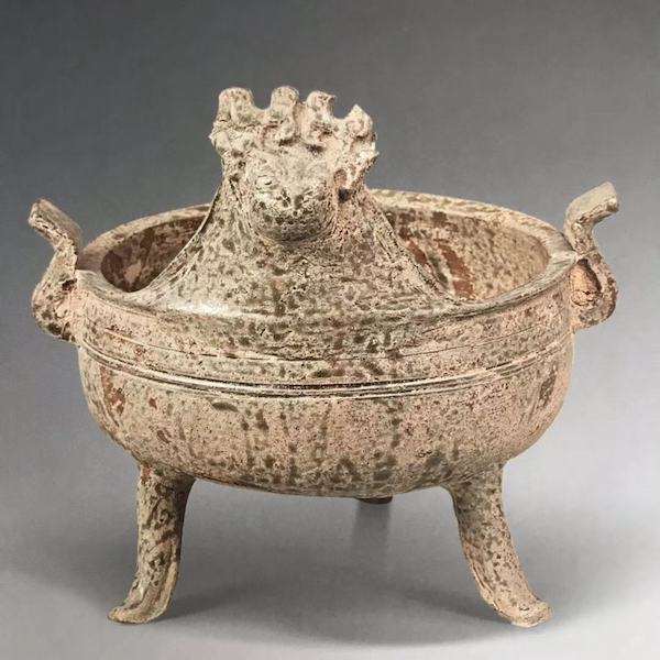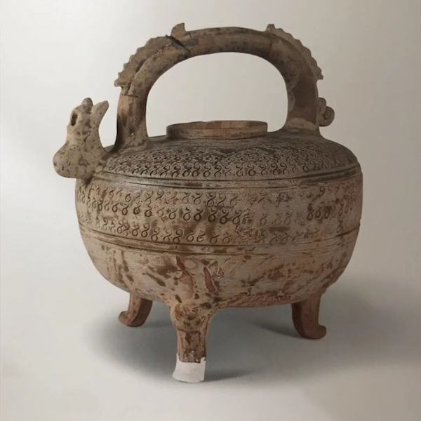 湖北省江陵县马山砖瓦厂M1出土,荆州博物馆藏。泥质灰陶。盖隆起,饰两周凸弦纹,附三兽钮,盖顶饰桥形钮。敛口,方形附耳较直,深直腹,中部饰一周凸棱,圆底,蹄足长直,上部饰兽面纹。腹底、足内侧施黑彩。