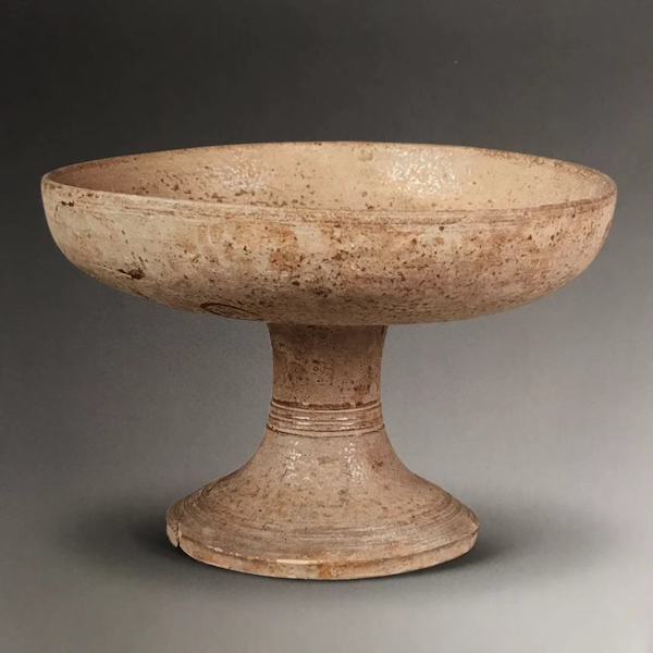 圆唇,直口,浅弧壁,短把,喇叭形圈足。把及圈足部饰凹弦纹数周。内外施青黄色薄釉,釉层不均,局部已剥落。