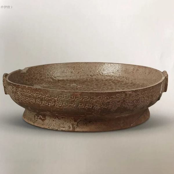 直口,浅弧腹,圈足外撤。口沿至上腹设附耳。耳面及外壁饰变体云雷纹。胎质灰黄。通体施青褐色釉,釉面斑驳。