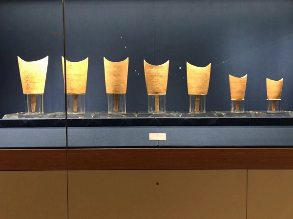 一套七件。口沿呈弧形,器身横截面呈椭圆形,向柄部渐收。柄部横截面呈长方形,分两段,向顶部渐收。器柄底部饰云雷纹,器身上两周云雷纹,下饰一周三角形内填云雷纹。施黄色青釉。