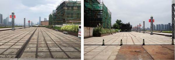场地位于船坞与杨树浦咖啡馆之间、防汛墙南侧,场地呈长方形,长约66米,宽约14.1米。地面为混凝土铺装,上嵌历史遗存的铜板条带方格框。
