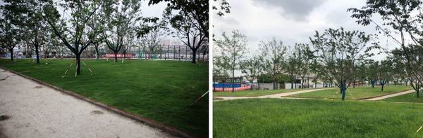 该场地位于规划的运动公园西北侧草坪树林,地形为不规则多边形,东西向最长边约49.5米、南北向最宽边约30米,地面铺装为草坪(百慕大混黑麦草),不均匀布置朴树和水杉,草坪中央有一条2.5米宽跑步道横向穿过,场地与防汛墙之间有宽约1米的散步道。