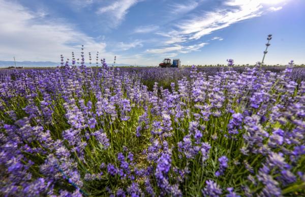 在新疆察布查尔锡伯自治县一处薰衣草花田里,农用机械在收割薰衣草。 新华社资料图
