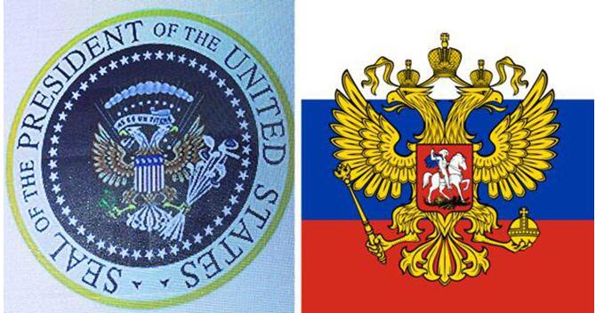 被恶搞的美国总统徽章(左)与俄罗斯国徽(右)